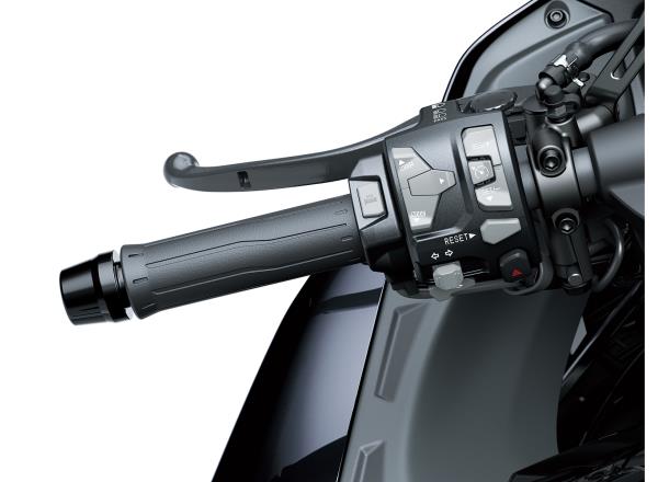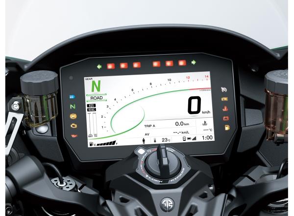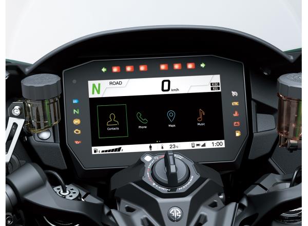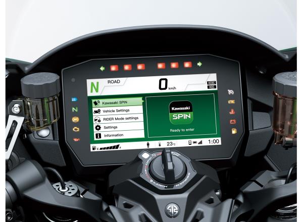 Large, easy-to-read 6.5” full-colour TFT instrumentation adds a high-tech touch to the cockpit. Complementing the multiple display modes and smartphone connectivity, compatibility with Kawasaki SPIN offers numerous infotainment possibilities.