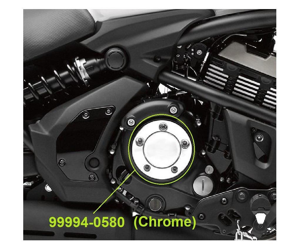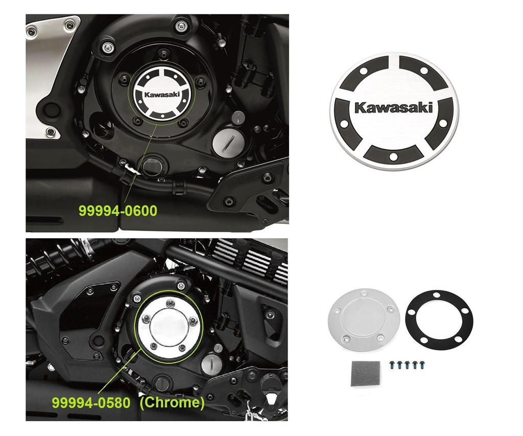 Black clutch cover plate with aluminium colored insert with Kawasaki logo.